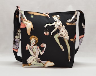 Handmade Gothic Black Widow Crossbody Bag, Ravens Skulls Print, Dark Academia Book Bag