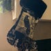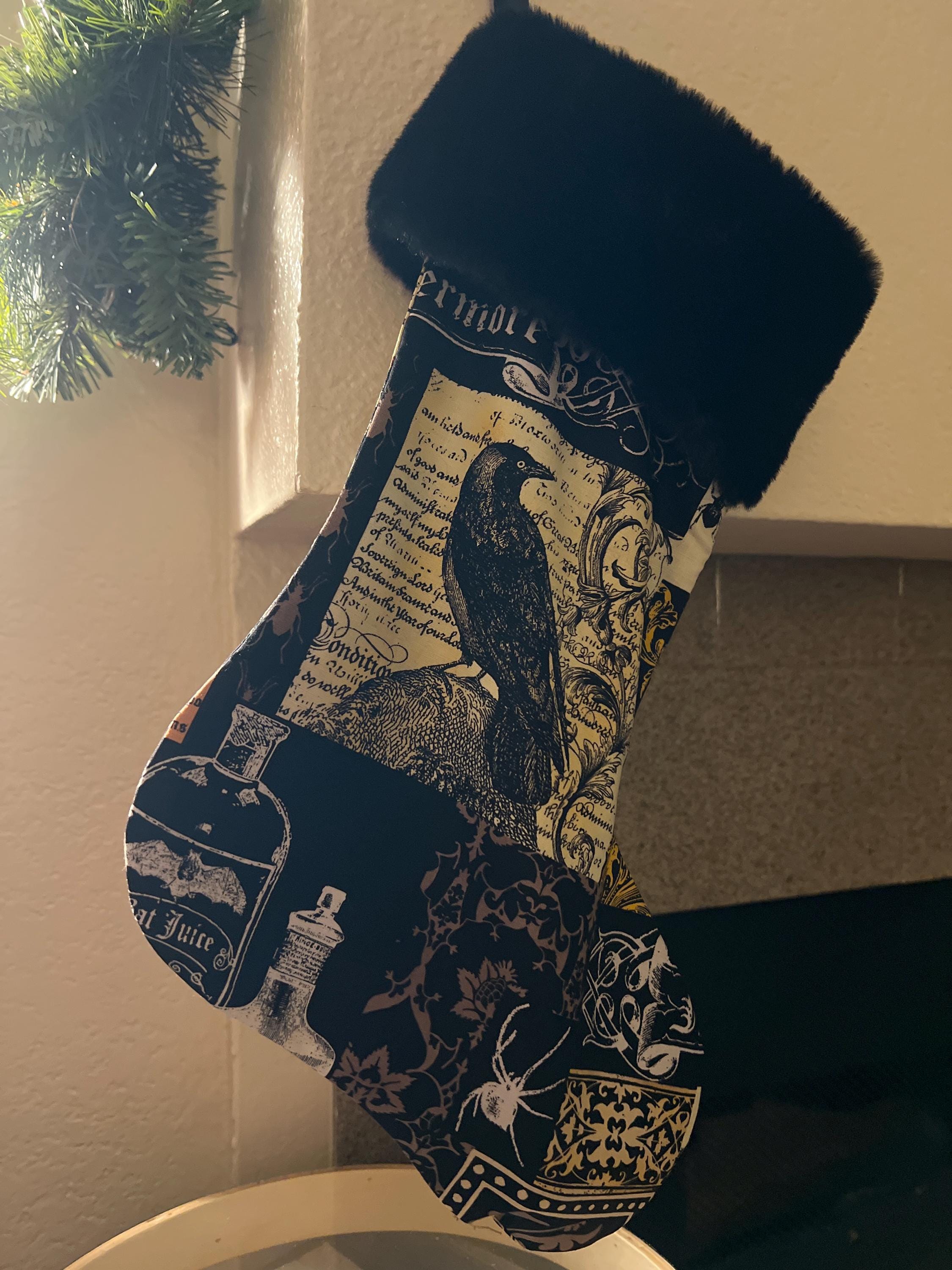 Nontraditional Christmas stocking features a 100% cotton beautiful gothic crow print on a black and sepia background, black faux fur, and a heavy weight twill ribbon sewn in for hanging. Lined with black canvas to help hold the shape when it’s empty.