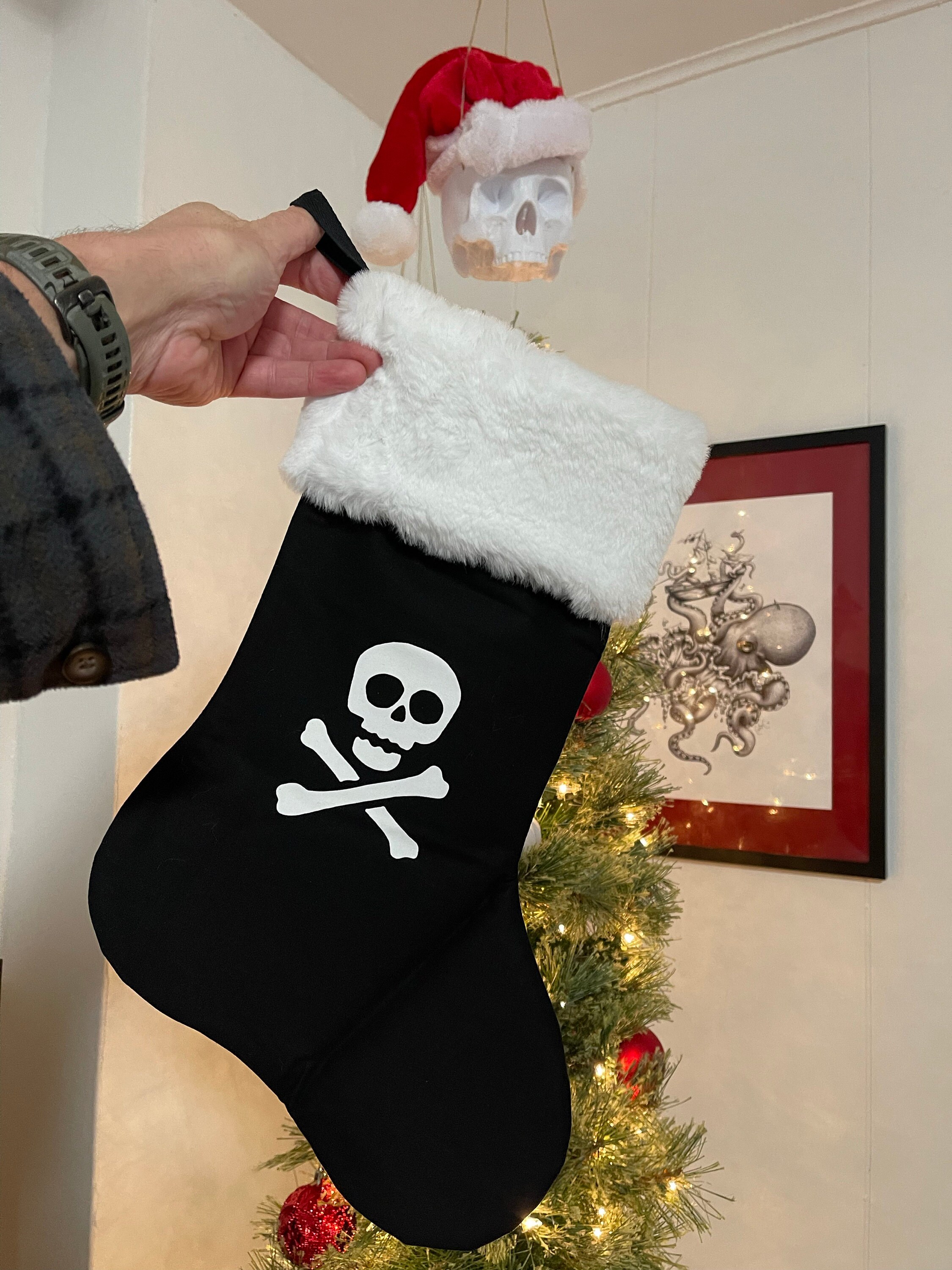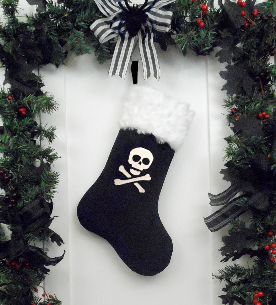 Nontraditional Christmas stocking features a white silkscreened skull and crossbones on black cotton fabric, white faux fur, and a heavy weight twill ribbon sewn in for hanging. Lined with black canvas to help hold the shape when it’s empty.