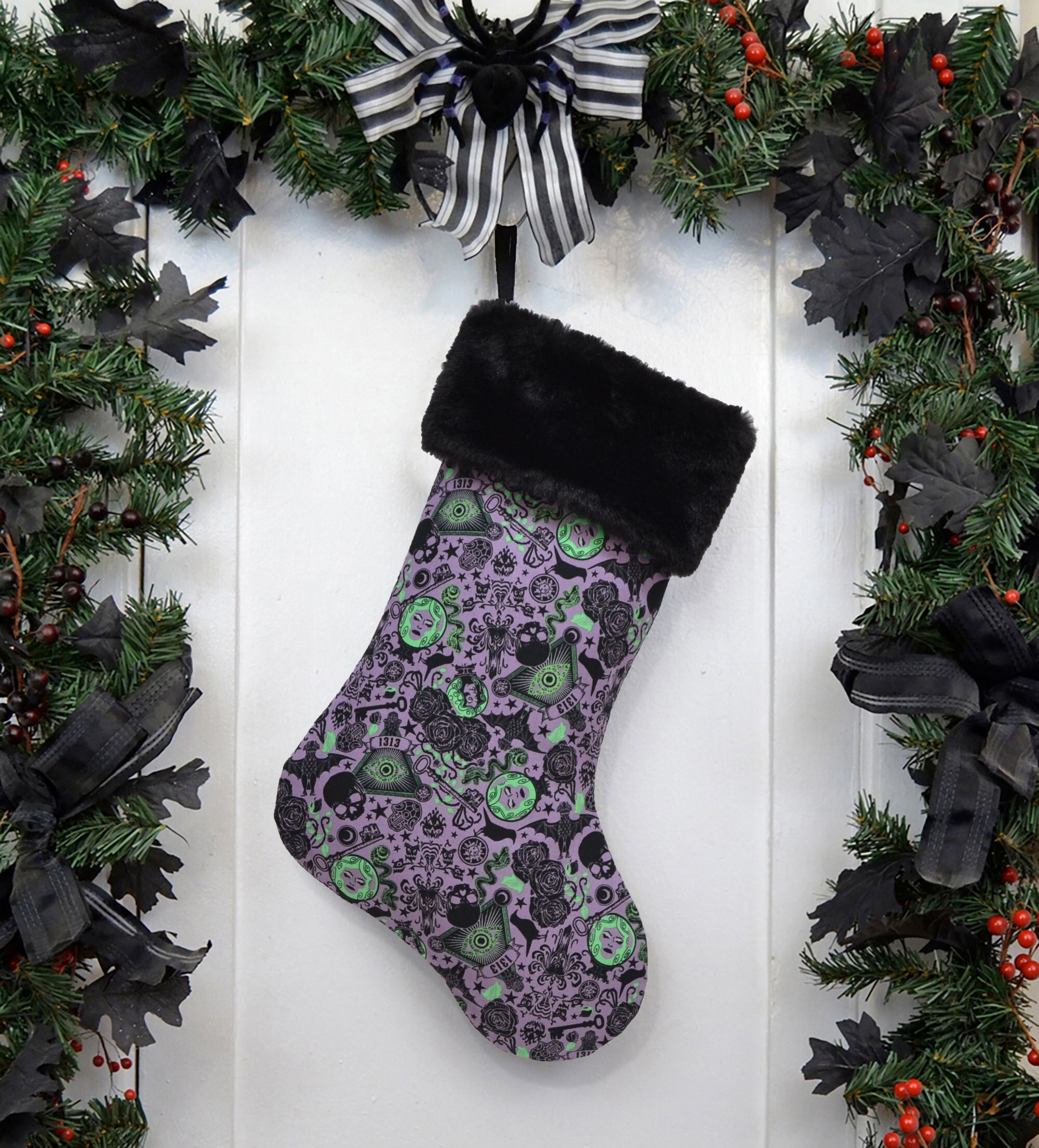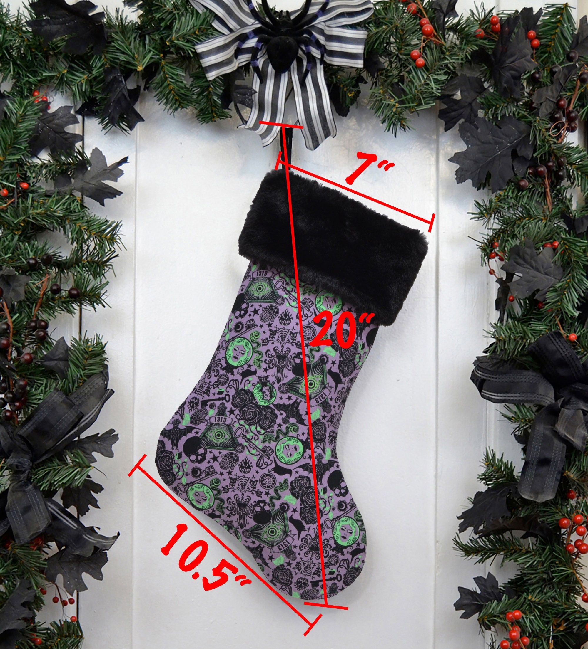 Nontraditional Christmas stocking features a 100% cotton black and lime green Haunted Mansion print on a purple background. It has a black faux fur cuff, and a heavy weight twill loop sewn in for hanging. Lined with black canvas to help hold the shape when it’s empty.