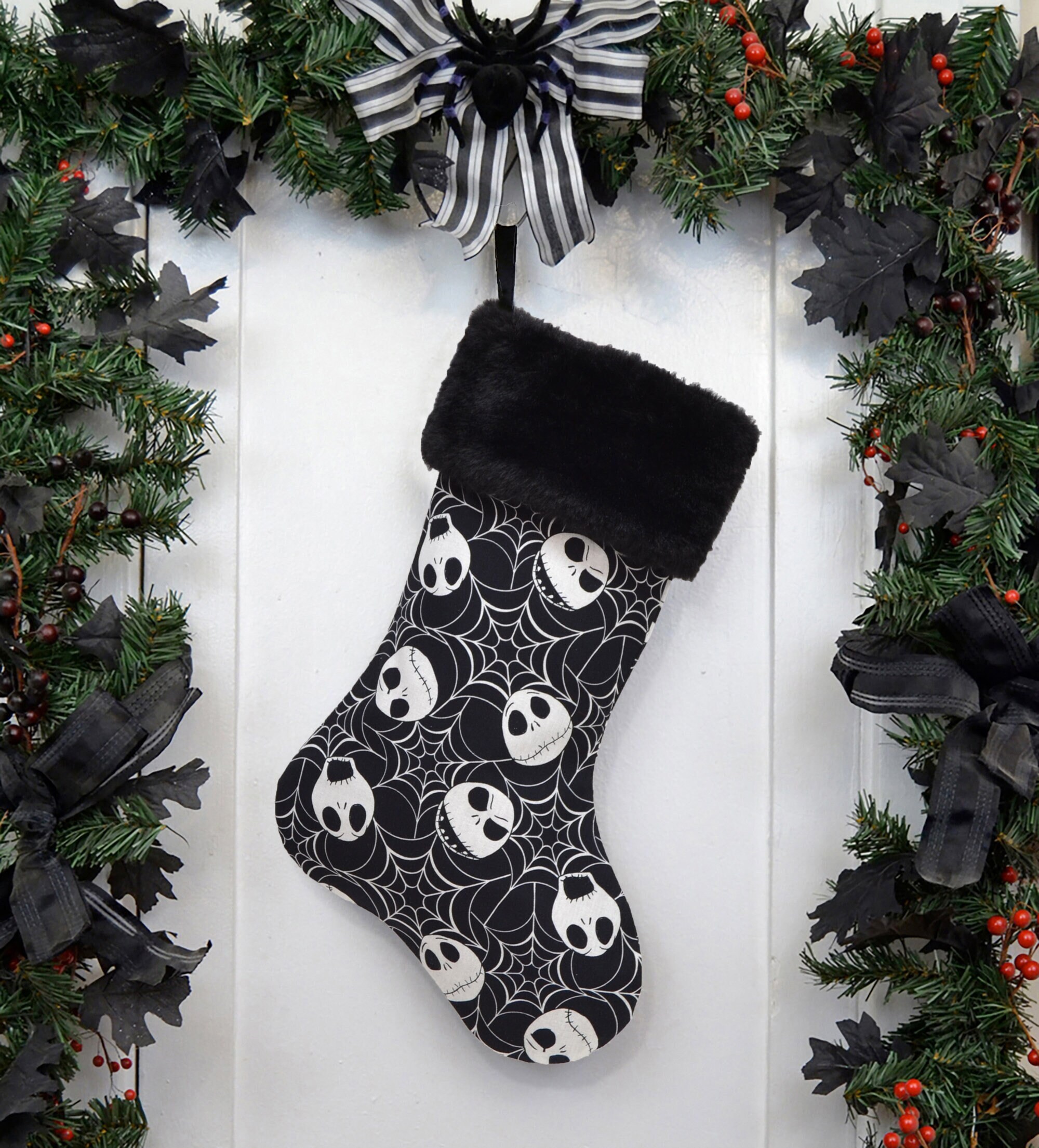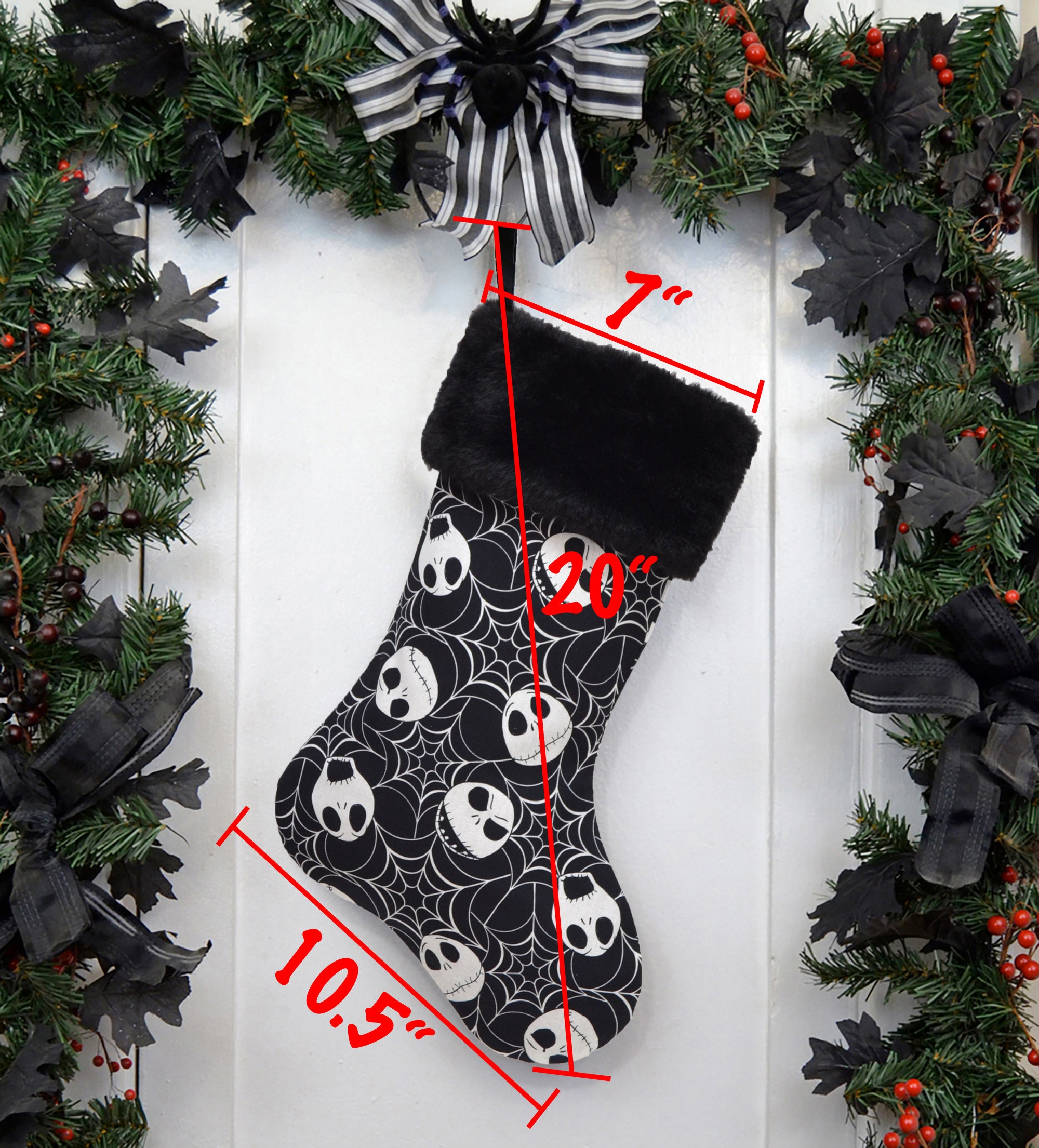 Nontraditional Christmas stocking features a 100% cotton black and white Nightmare Before Christmas print, with Jack's facial expressions on a spider web background. It has a black faux fur cuff, and a heavy weight twill loop sewn in for hanging. Lined with black canvas to help hold the shape when it’s empty.
