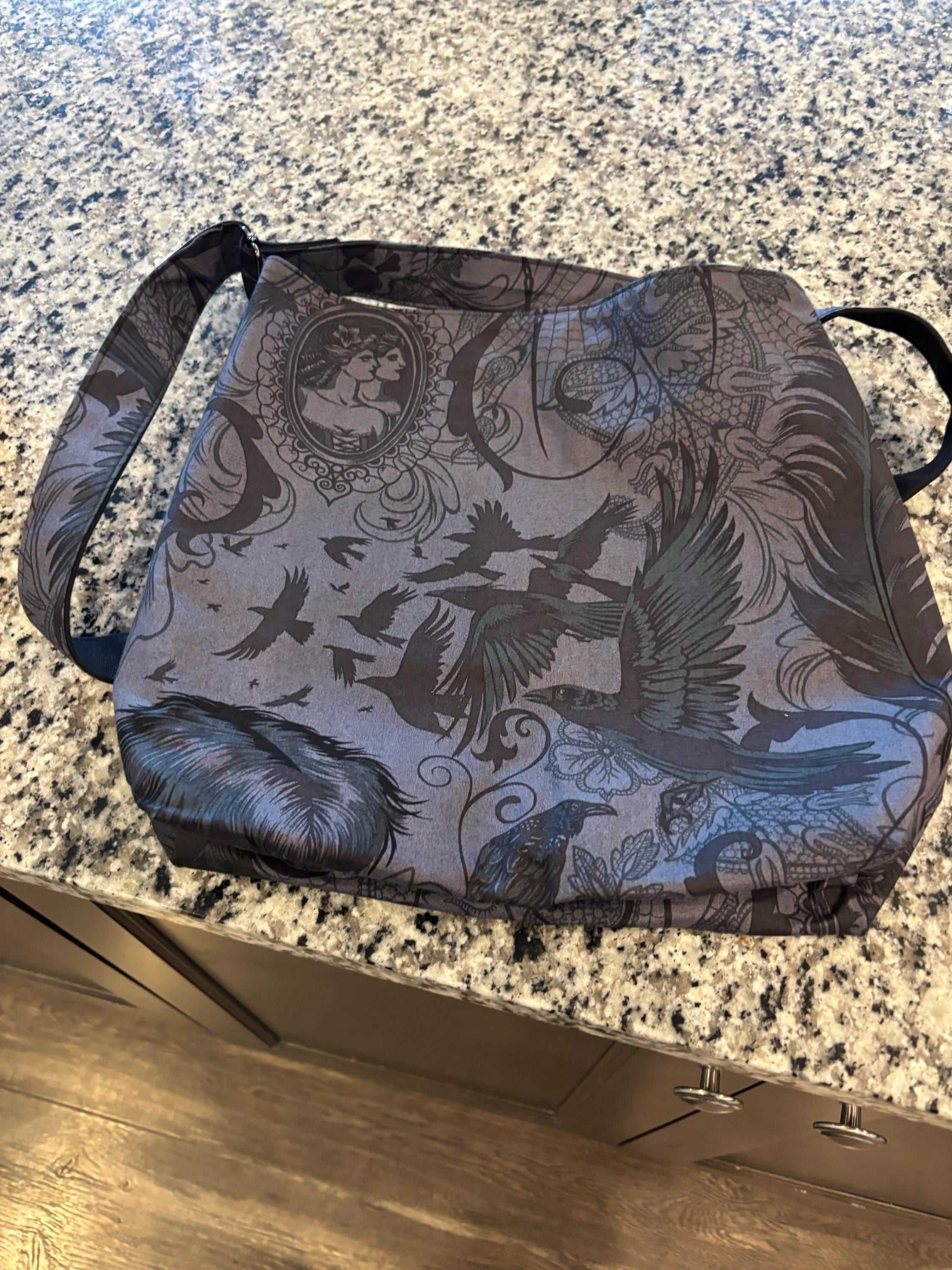 Large utilitarian crossbody bag features a 100% cotton charcoal gray black widow gothic print with ravens and skulls. Plus, a layer of medium weight interfacing for a sturdy structure.