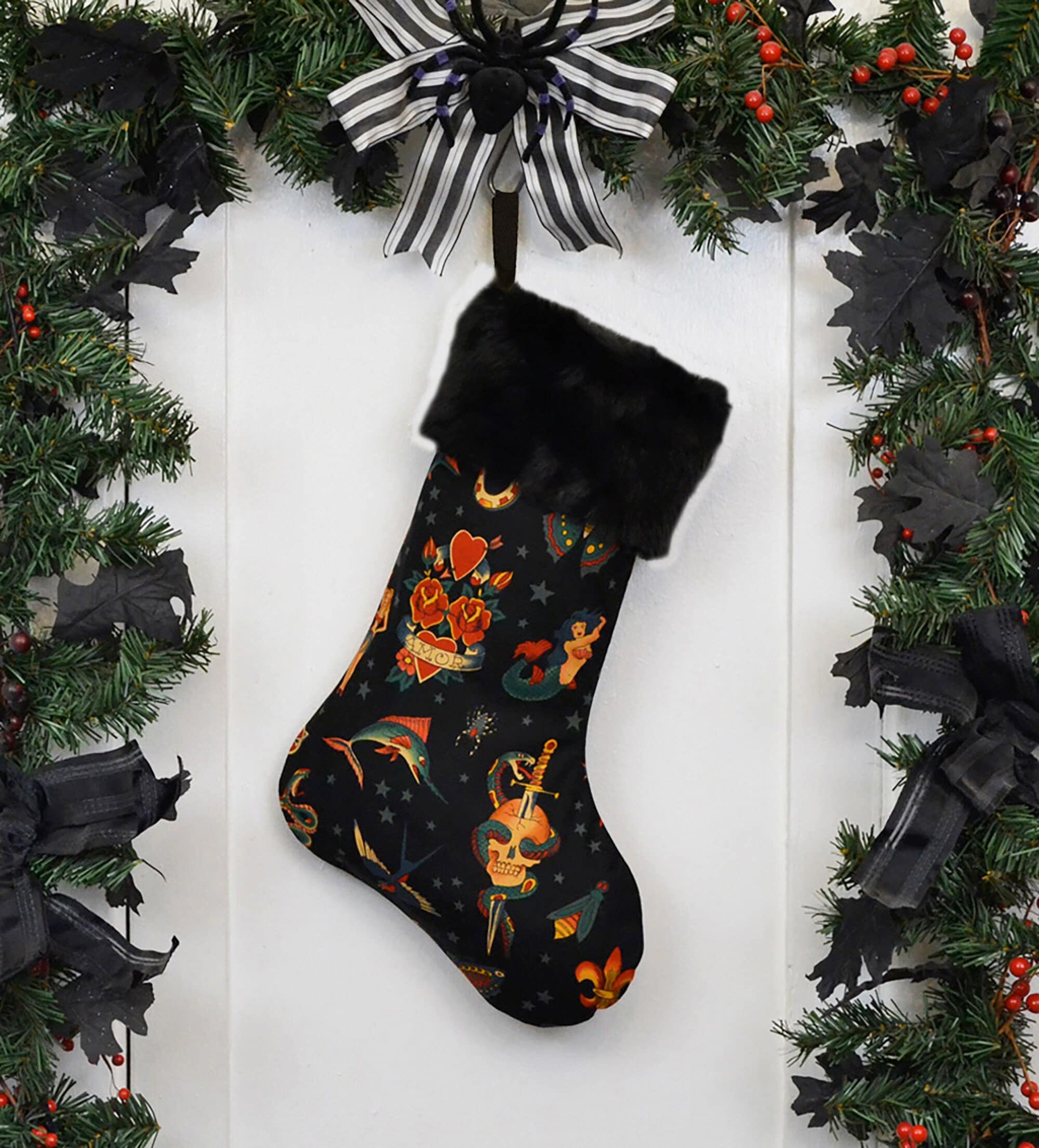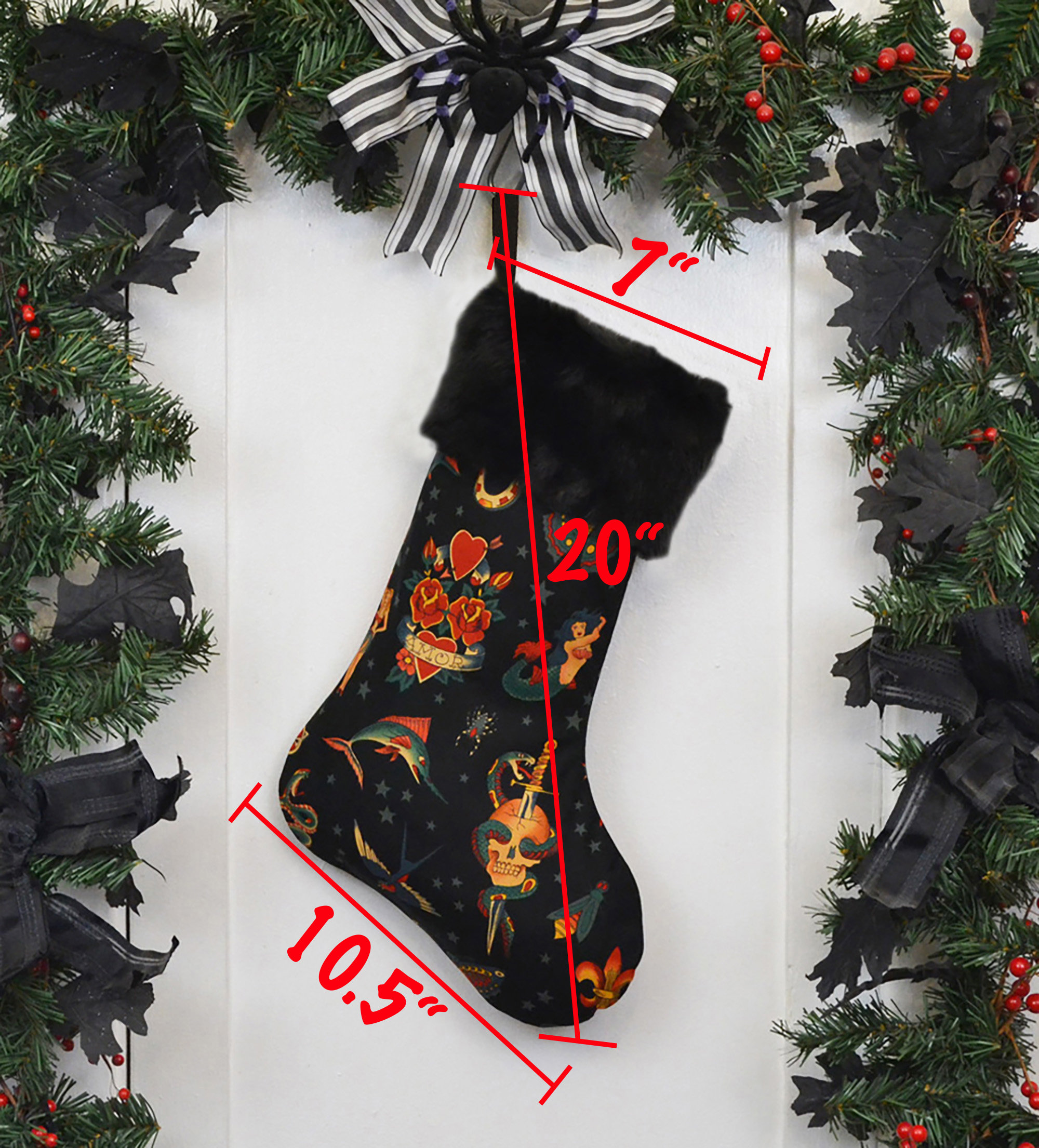 Nontraditional Christmas stocking features a series of classic vintage tattoos on a black background, black faux fur, and a loop of heavy weight twill tape sewn in for hanging. Lined with black canvas to help hold the shape when it’s empty.