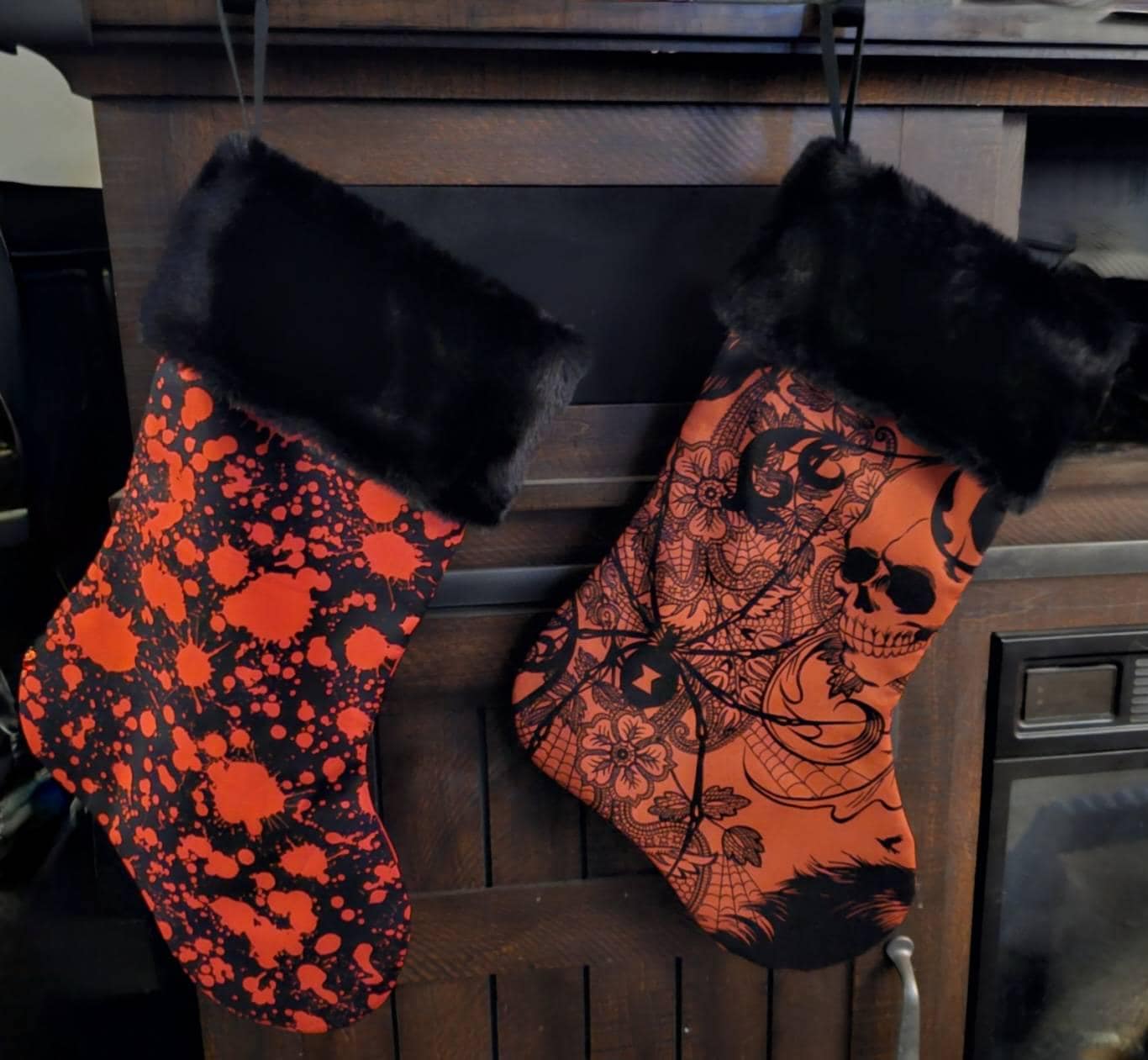 I purchased 2 stockings and they got here fast! The fur on top is super soft and the quality of both the materials and the craftsmanship are superb!! We do a kind of krampus Christmas in our house so I have been amazed at how many other people are into the creepmas style as well and I really appreciate all the options on here!! It was really hard to choose just 2 from this shop alone but we are extremely happy with them. The only somewhat bummer is the red on the spider/skull one isn't as vibrant as the blood splatter one so it looks a little off next to it but it's no biggie we are going to put dad's metallica one in the middle problem solved ;)