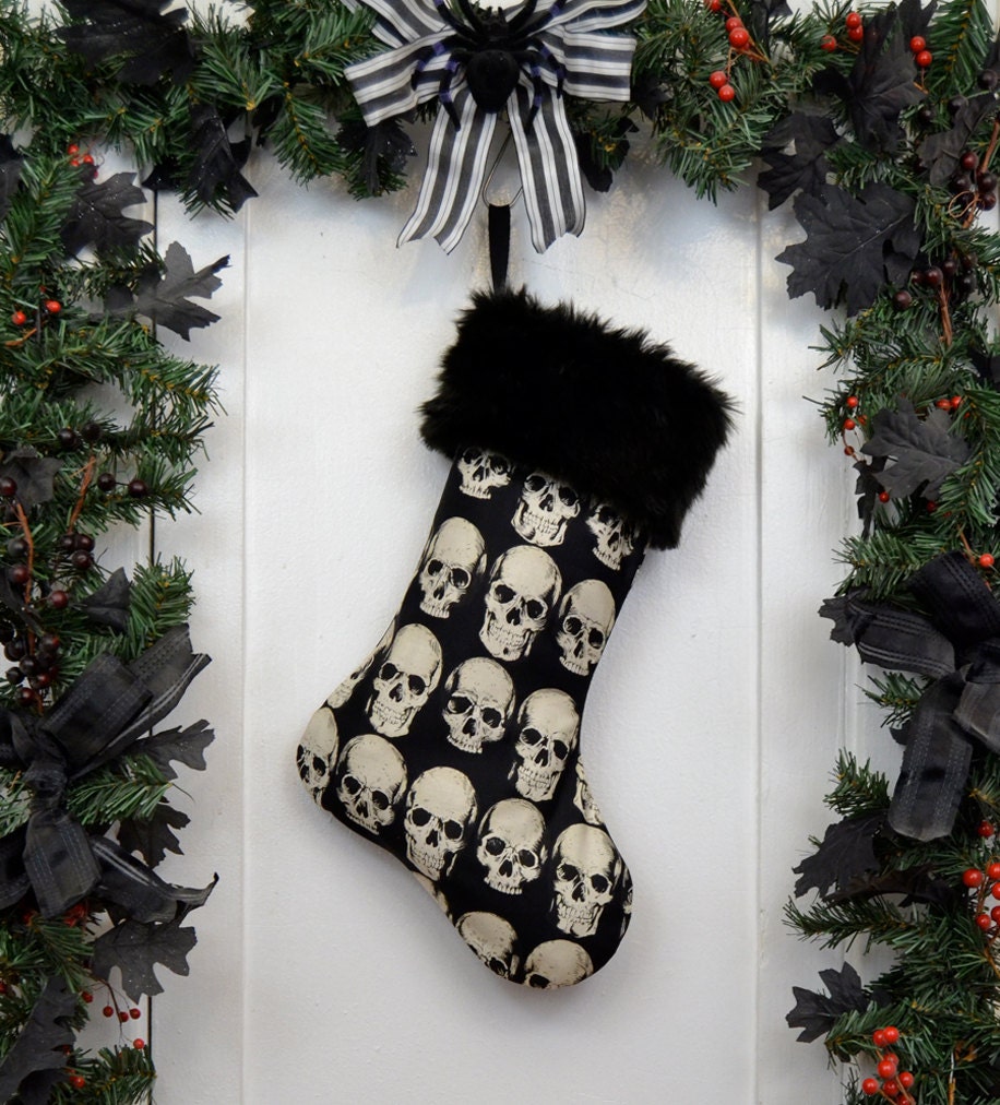 This nontraditional Christmas stocking features a light cream color realistic skull print on a black background, black faux fur, and a heavy weight twill ribbon sewn in for hanging. Lined with black canvas to help hold the shape when it’s empty.