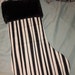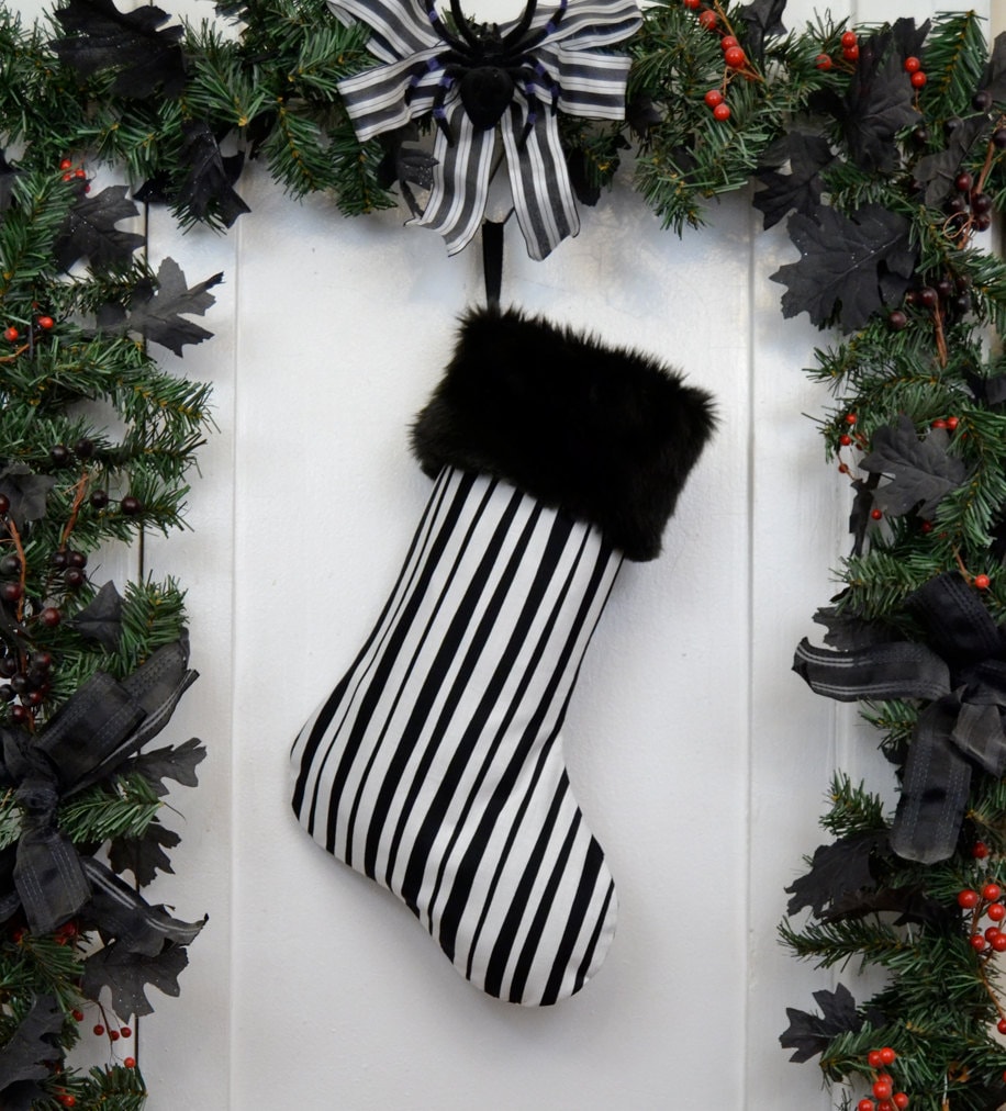 This nontraditional Christmas stocking features a black and white vertical stripe pattern, black faux fur trim, and a heavy weight twill ribbon sewn in for hanging. Lined with white canvas to help hold the shape when it’s empty.