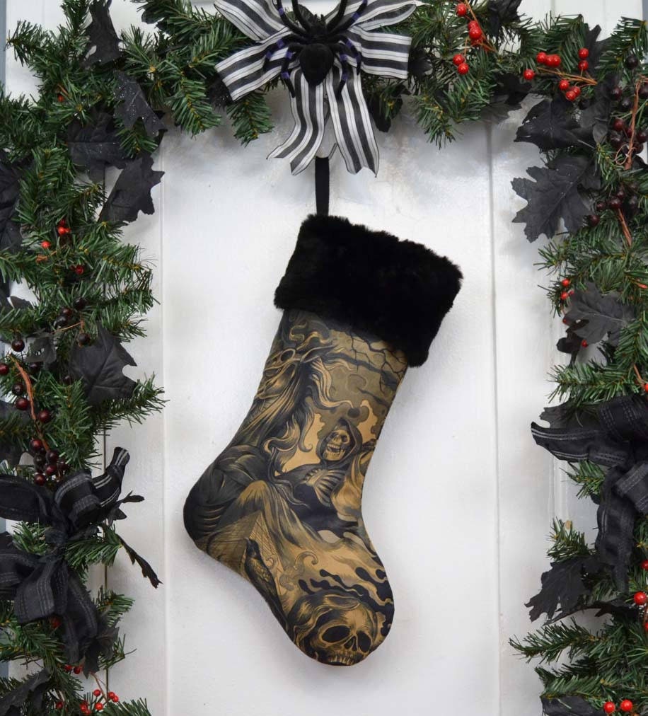 MADE TO ORDER Nontraditional Halloween Christmas stocking features a 100% cotton black and tan print of the Grim Reaper riding his skeleton horse, black faux fur trim, and a heavy weight twill ribbon sewn in for hanging. Lined with black canvas to help hold the shape when it’s empty.