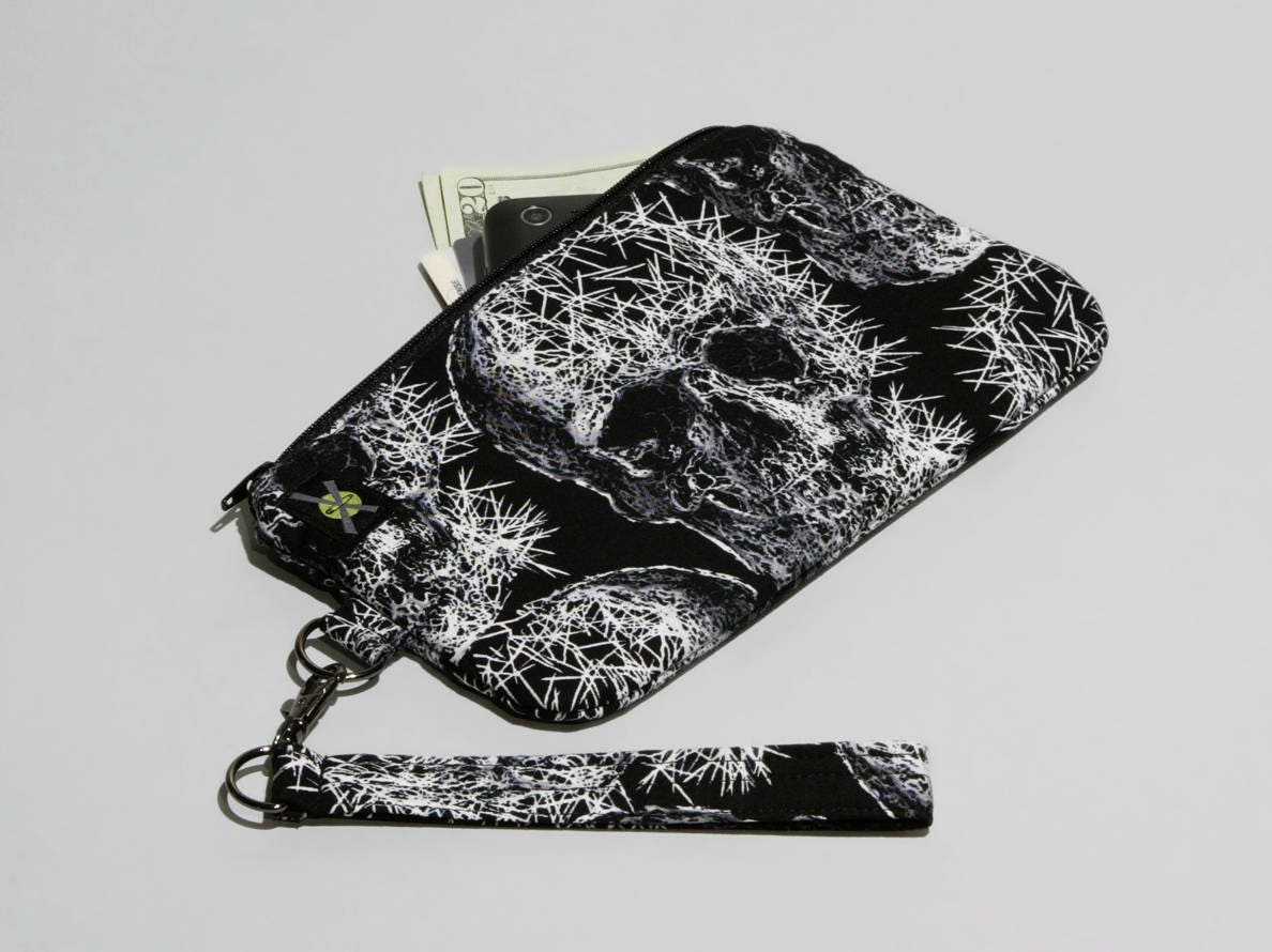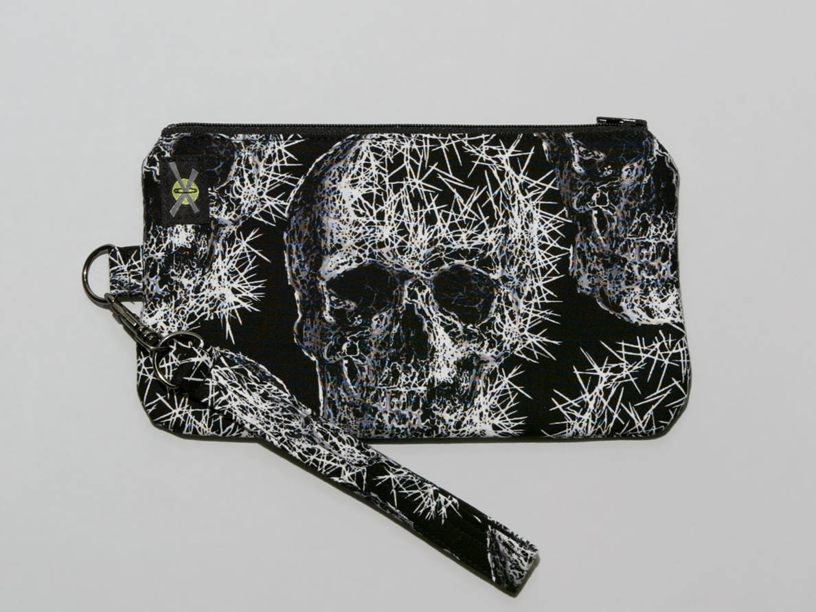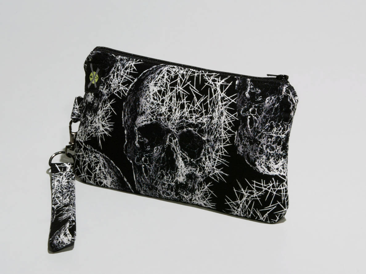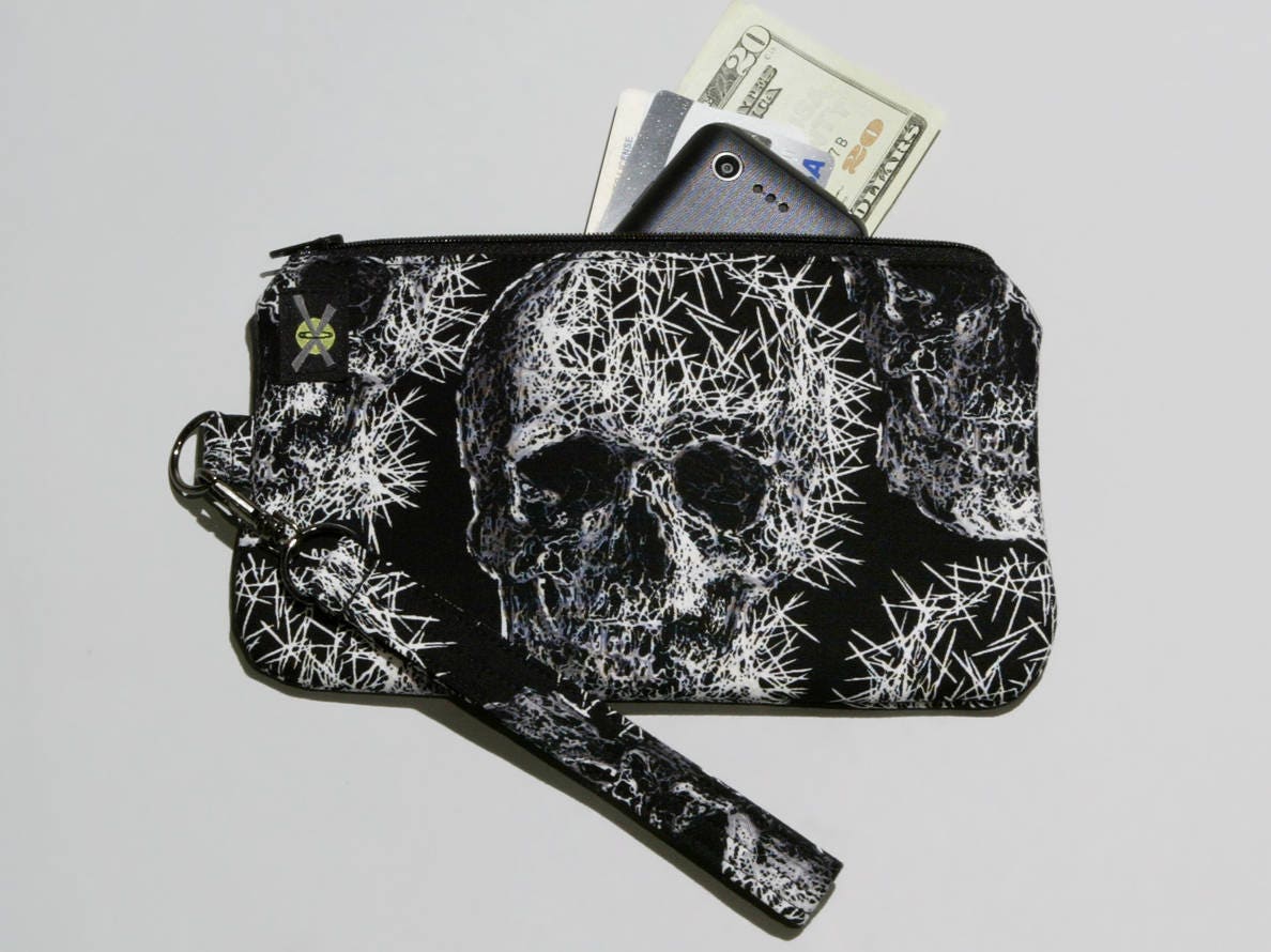 MADE TO ORDER Skulls phone purse wristlet features a 100% cotton black and white shattered/splintered skulls print.