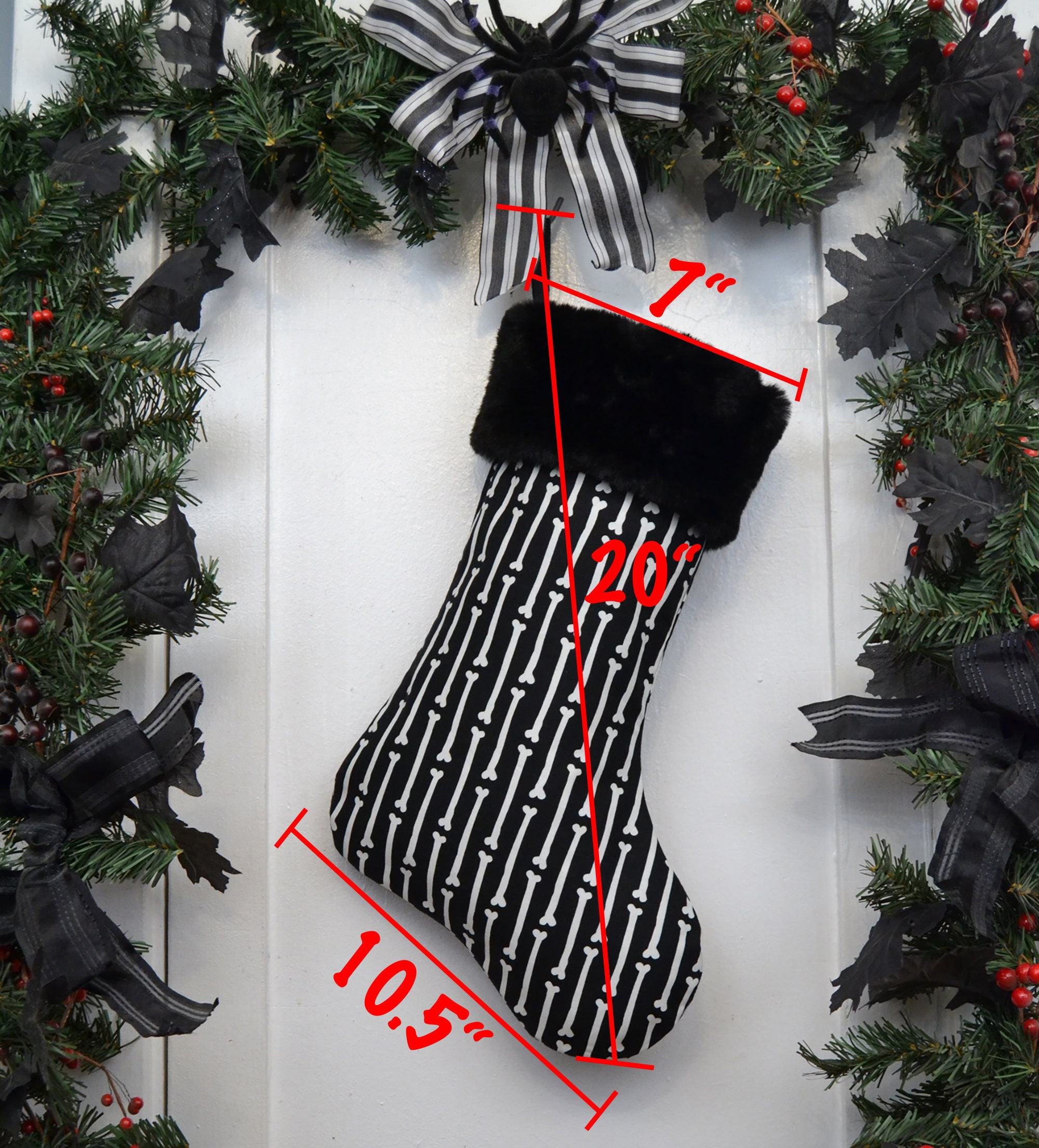 Nontraditional Christmas stocking features a 100% cotton black and white striped skeleton bone print. It has a black faux fur cuff, and a heavy weight twill ribbon sewn in for hanging. Lined with black canvas to help hold the shape when it’s empty.