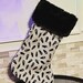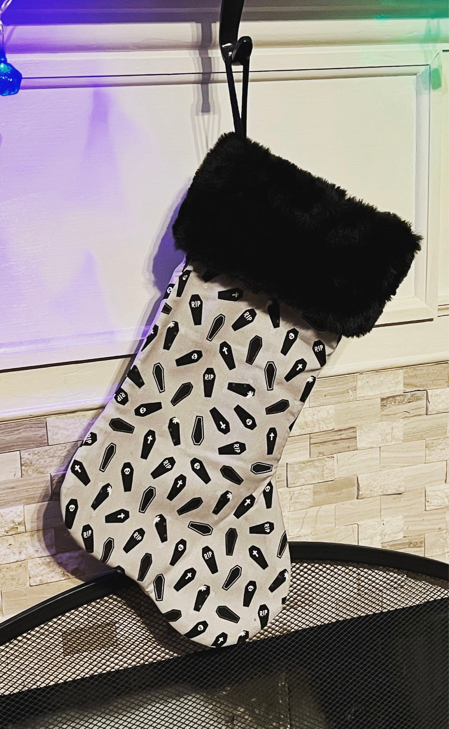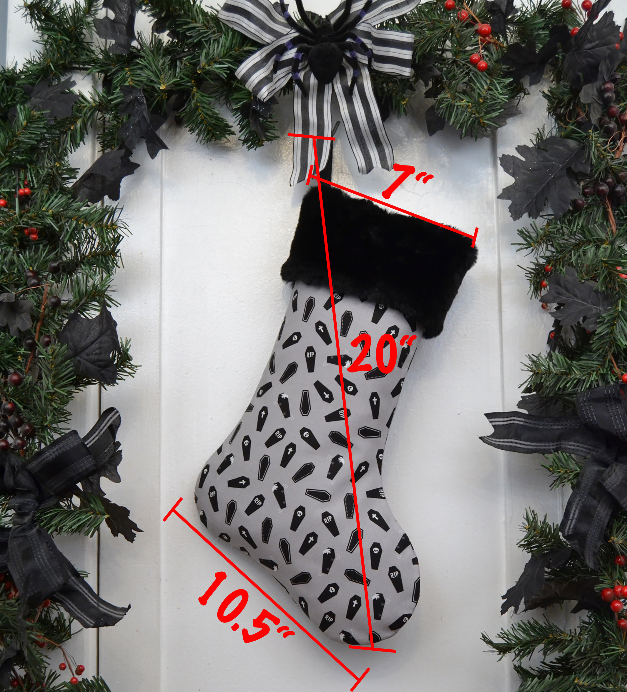Halloween Christmas stocking features a 100% cotton black and light gray mini coffins print. It has a black faux fur cuff, and a heavy weight twill ribbon sewn in for hanging. Lined with black canvas to help hold the shape when it’s empty.