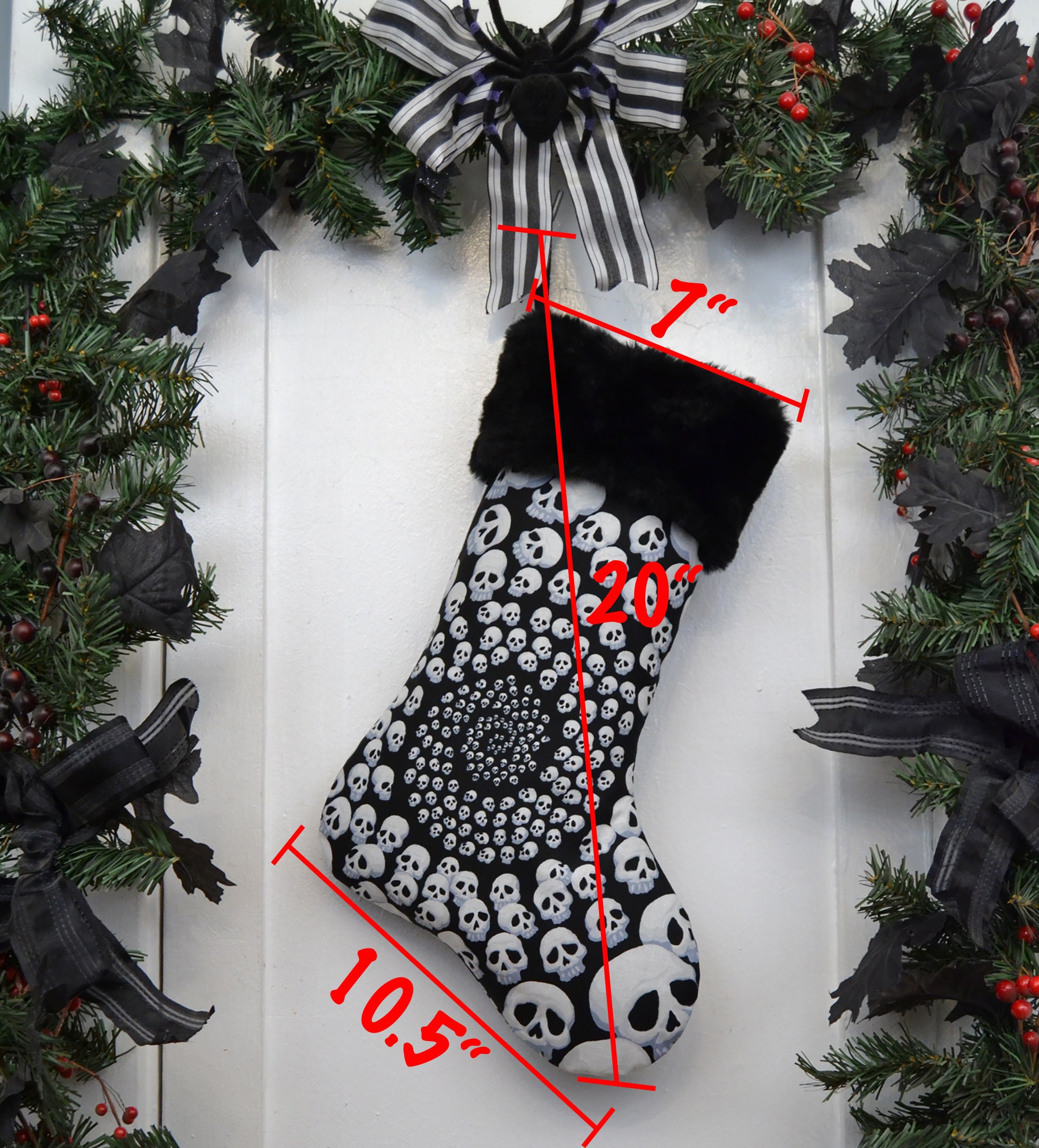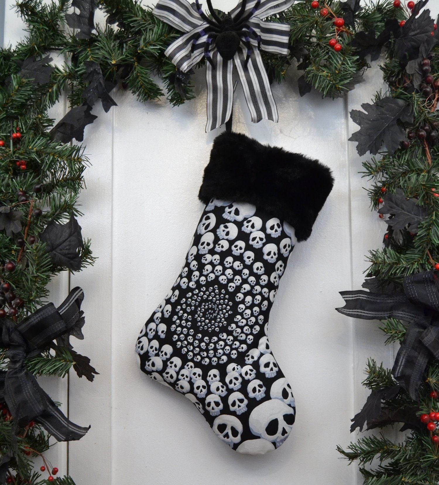 Nontraditional Christmas stocking features a 100% cotton black and white infinity skulls print, black faux fur, and a heavy weight twill ribbon sewn in for hanging. Lined with black canvas to help hold the shape when it’s empty.