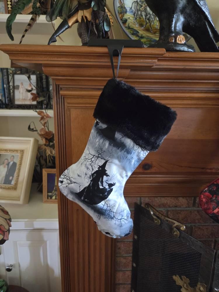 Nontraditional Christmas stocking features a 100% cotton fabric moon goddess witch print. She wears a long black dress and pointy witch hat, and is with her black cat and raven familiars. The stocking has a black faux fur cuff, and a heavy weight twill ribbon sewn in for hanging. Lined with black canvas to help hold the shape when it’s empty.